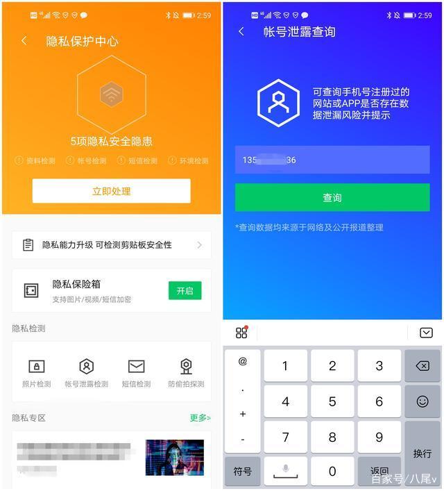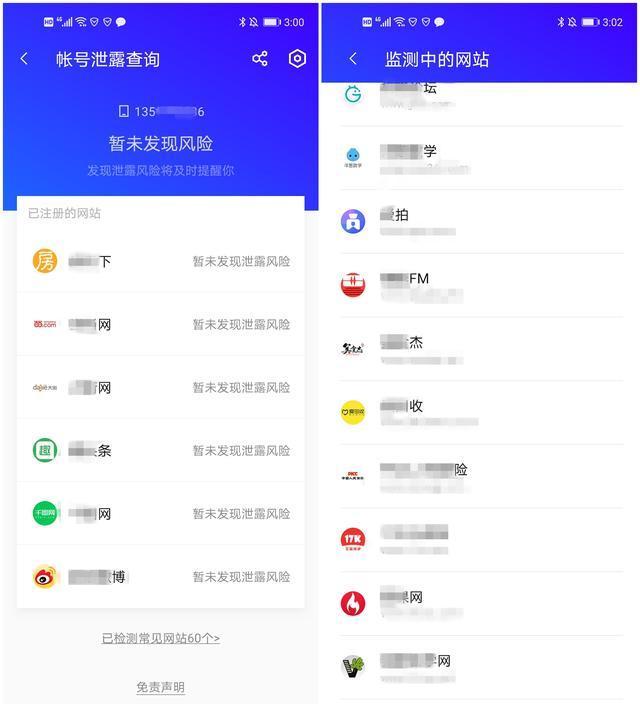 点击“账号泄露检测”,输入个人手机号,接收短信验证码,输入后开始检测。