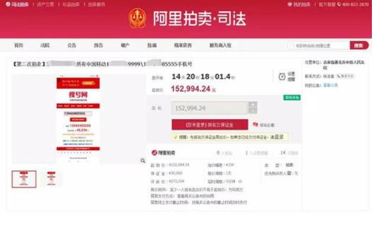此前阿里司法网上拍卖成交价最高的重庆手机号码,也是中国移动的13647666666,2018年6月28日至6月29日,在黑龙江省伊春市西林区人民法院举行的拍卖会上,拍卖起拍价为20万元。3人报名,报名订金1万元。经过12次竞拍,最终成交24万元。当时,手机号码的评估价是32万元。